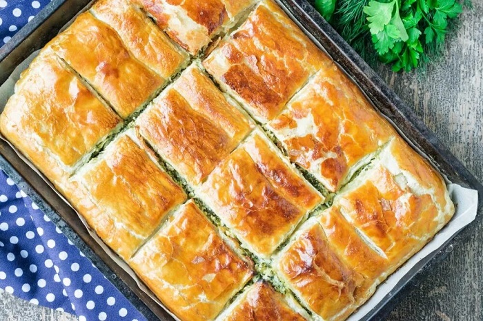 Сочно, быстро, просто и вкусно – вот, что можно сказать об этом пироге. Основой будет 400 граммов слоеного теста (два пласта), а в качестве начинки возьмите следующие ингредиенты: пучок свежего шпината, две столовых ложки сметаны или греческого йогурта, три яйца (один желток оставьте для смазывания), один зубчик чеснока, 200 граммов творога, 100 граммов сулугуни, 100 граммов брынзы, одна чайная ложка прованский трав, соль и черный молотый перец по вкусу, кунжут для посыпки.