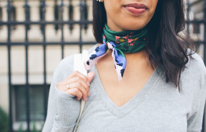 Благодаря платку на шее можно удачно её замаскировать. Самые обычные модели, а так же сложные и дорогие шелковые, интересные трендовые, с бахромой или рисунками, отлично подойдут. Такой аксессуар будет хорошо гармонировать с сумкой или верхней одеждой. Но куда важнее чтобы он подходил к верхней части наряда в целом. Если отдать предпочтение вариантам из шелка, а также шифона, получится не перегрузить образ, сделать лёгким и воздушным. Цвет платка может совпадать с цветом блузки, или наоборот быть контрастным по отношению к ней. В любом случае образ получится интересным. С платком, как аксессуаром, будут отлично сочетается джинсы классические брюки, оба этих варианта тут же станут нежнее. А если в наряде будет присутствовать юбка, вы будете выглядеть намного женственнее и элегантнее.