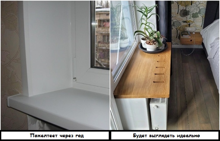 И снова с нами на связи пластик. Не только плинтуса из этого материала выглядят дешево, но еще и подоконники. Обычно их ставят «по умолчанию», как что-то само собой разумеющееся, потому что решение простое, бюджетное и универсальное. Но в плане практичности есть вопросы. Со временем пластик желтеет, на поверхности появляются потертости и царапины, плюс он быстро «впитывает» в себя различные загрязнения, например, следы от горшков с комнатными цветами.