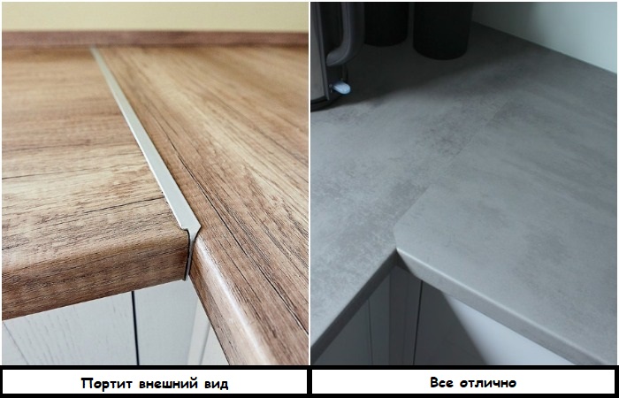 Если у вас Г-образная или П-образная кухня, приходится думать, чем закрывать швы между частями столешницы, в которых постоянно накапливается пыль, грязь и частички пищи. Сделать это можно разными способами, но самым простым и дешевым решением являются тонкие алюминиевые планки. Пожалуй, цена – это их единственный плюс.