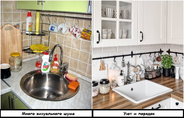 Кстати, о визуальном шуме. Чаще всего он возникает из-за обилия бытовой химии на бортиках мойки. Согласны, на кухне все должно быть под рукой, чтобы не приходилось тратить много времени на поиски нужного средства, но не стоит игнорировать эстетическую составляющую.