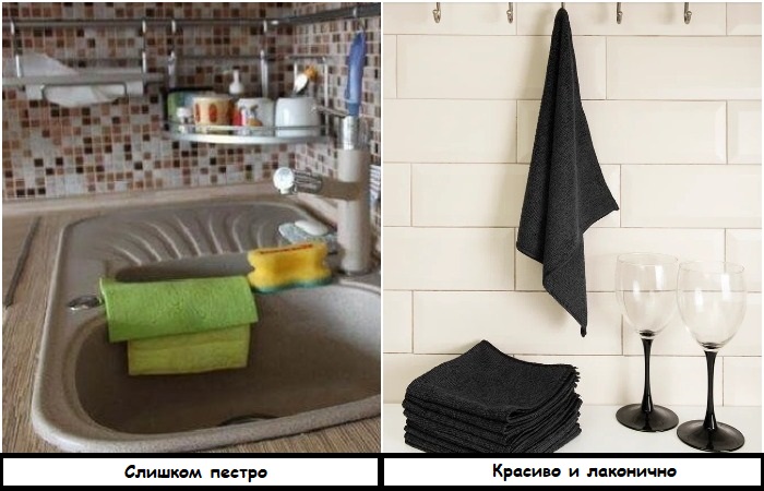 Если вы применяете салфетки не только во время уборки, и они нужны под рукой постоянно, тогда либо купите изделия нейтрального цвета (черные, серые, бежевые) и сушите их на специальной подставке, либо отдайте предпочтение бумажным полотенцам, которые можно мочить и использовать для протирки столешницы и других поверхностей. Также можно отказаться от микрофибры в пользу салфеток из хлопка или льна. Они служат гораздо дольше, не впитывают запахи, не разводят грязь и выглядят гораздо симпатичнее.