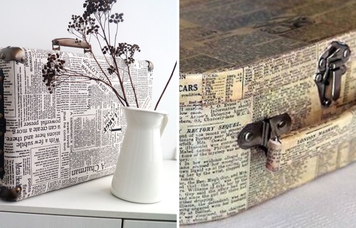 Один из мастеров декупаж предлагает сделать декоративные чемоданы, которые смогут украсить ваш дом или творческую мастерскую. Для создания таких удивительных чемоданов понадобятся лишь коробки и старые газеты. Из коробок следует сделать основание, а газетами задекорировать их, используя технику декупаж.