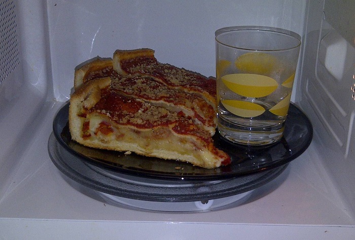 На заметку: Стакан с водой пригодится в микроволновке и в другом случае – если вы будете разогревать остывший кусочек пиццы, хачапури или любое другое хлебобулочное изделие. Когда вы ничем не накрываете еду, в процессе разогрева она теряет много влаги и сильно подсыхает. А пар, который будет выделяться от стакана с водой, поможет решить эту проблему – выпечка вновь станет мягкой и воздушной.