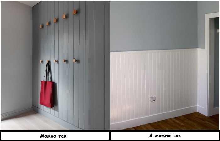 Обязательно учитывайте фактуру и цветовую гамму материала. Например, панели, имитирующие рейки, поддержат общую динамику и отвлекут внимание от низких потолков. Что касается оттенков, то следует использовать холодные наверху и темные внизу, чтобы создать плавный переход.