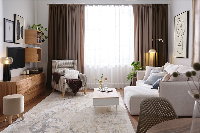 Еще один рабочий способ, который поможет визуально приподнять высоту потолка – повесить на окна длинные шторы до пола. Они могут быть однотонными или с вертикальным узором, который «вытянет» помещение. Если же в комнату попадает мало света или за окном открывается красивый вид, вместо плотных гардин можете повесить тонкие, полупрозрачные занавески, которые не будут привлекать слишком много внимание.