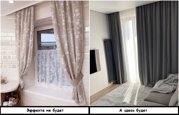 Длинные шторы увеличат высоту потолка, а короткие – нет