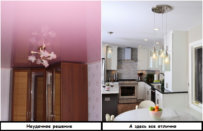 Объемная люстра, расположенная по центру потолка, сделает его визуально ниже, а площадь комнаты – меньше. К тому же, если кто-то из членов семьи высокого роста, он постоянно будет задевать ее головой. Чтобы решить все проблемы одним махом, вместо громоздкой люстры используйте минималистичные модели, которые плотно прилегают к потолку и гармонично сочетаются с ним по цвету (можно даже выбрать светильник в тон потолка).