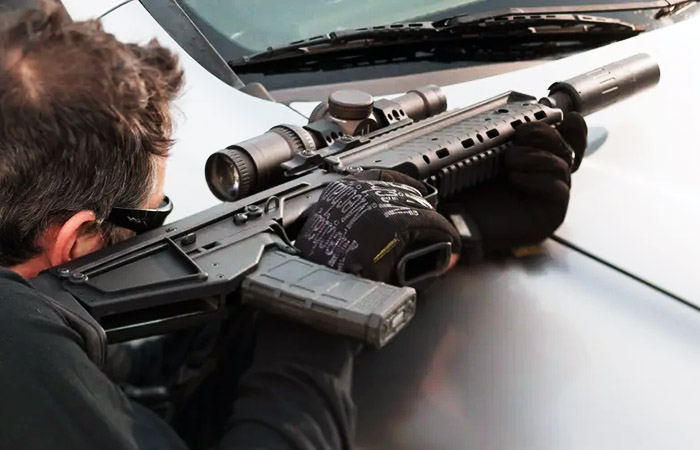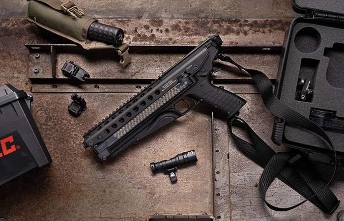 SUB-2000 часто сравнивают с конструктором: в сложенном виде он превращается в аккуратный прямоугольник, который легко уместится в рюкзак или бардачок. Всё дело в том, что ствол складывается назад и фиксируется вдоль приклада — получается не оружие, а компактный свёрток. При этом карабин стреляет обычными пистолетными патронами, чаще всего 9×19 или .40, и питается от стандартных магазинов Glock или других популярных пистолетов.