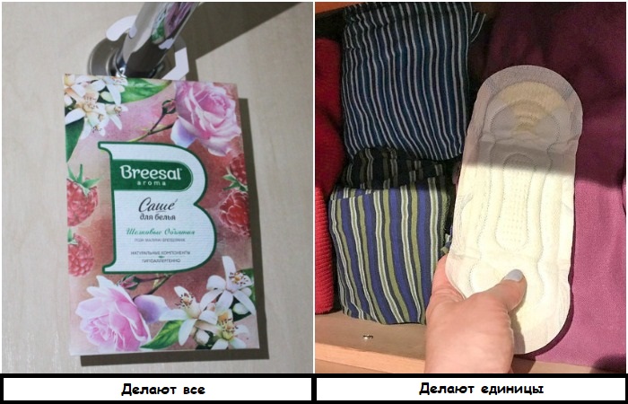 Итак, отрежьте от прокладки «крылышки» и разделите ее на несколько частей. Далее сбрызните их духами (пары пшиков будет достаточно) и закрепите на стенках шкафа. Готово! Уже через пару часов в шкафу будет витать потрясающий запах.