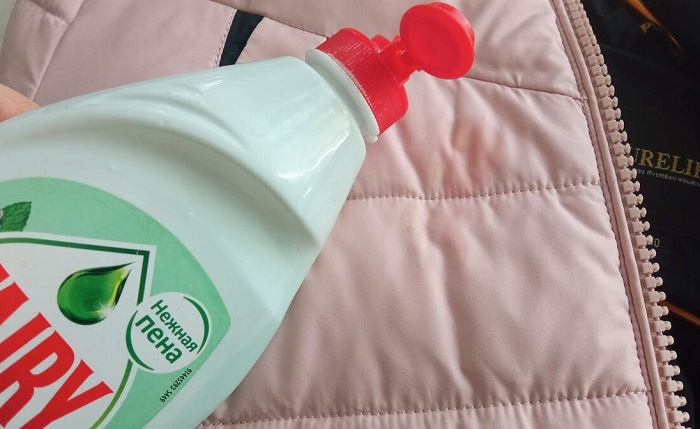 Процедура очень простая. Нужно смочить пятно теплой водой, нанести на ткань немного жидкости для посуды и интенсивно потереть загрязненный участок (для удобства можете использовать губку). Оставьте вещь на 15-20 минут, чтобы средство подействовало, а затем постирайте ее вручную или в стиральной машине.