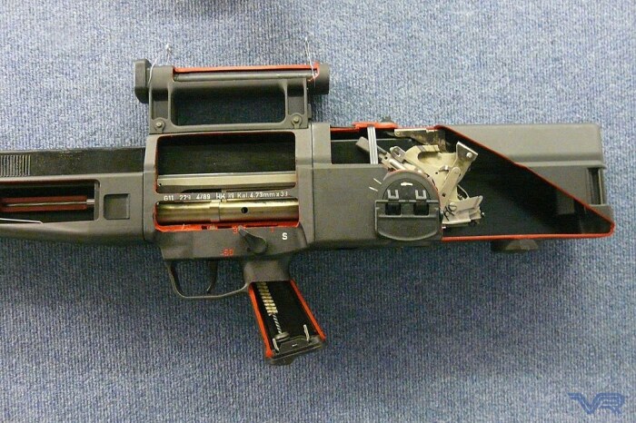 На пальцах идея была проста: нужно создать такой патрон, где функцию гильзы будет выполнять спрессованный порох, внутри которого и будет располагаться пуля. Нужно ли говорить, что технически реализовать концепцию оказалось непросто? Больше всего проблем доставлял именно порох. Долгое время у немцев не получалось сделать его достаточно твёрдым. Патроны получались хрупкими и рассыпались не только при попытке использования, но даже при транспортировке. Постепенно характеристики боеприпаса всё-таки удалось довести до приемлемых значений, однако транспортировать новый 4.7х33 мм всё равно рекомендовалось в специальных пластиковых контейнерах. Таким образом фактически безгильзовый патрон становился только после снаряжения в магазин. Но на этом проблемы не кончились…