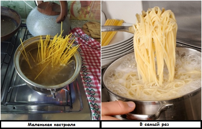 Хорошо, когда на вашей кухне есть широкая и глубокая кастрюля – она идеально подойдет для приготовления полноценной пасты, так как в нее сразу можно погрузить длинные макароны. Нет такой посуды? Ничего страшного. Возьмите обычную кастрюлю, закипятите воду и поставьте в нее спагетти. Как только вы увидите, что нижняя часть немного размягчилась (на это потребуется секунд 20), возьмите лопатку и слегка надавите ею на верхнюю часть, чтобы полностью погрузить макароны в воду. В конце перемешайте их вилкой, чтобы не слиплись, и варите на среднем огне.