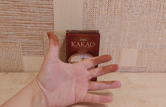 Чтобы определить натуральность продукта, вам не потребуется ничего кроме собственных рук. Просто разотрите щепотку какао порошка в руках и стряхните его. Если перед вами натуральный продукт, то на пальцах останется маслянистый след, который не так-то просто смыть. Если же никакого следа не осталось, то перед вами продукт далекий от какао бобов.