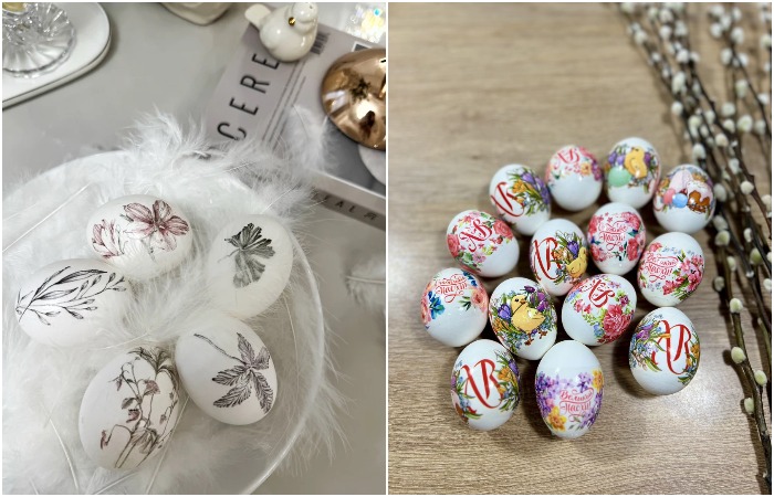 Термонаклейки – это более привычный для нас вариант, который мы часто используем для декора яиц. Разрежьте их по намеченным линиям, чтобы получилось несколько прямоугольников с рисунками, и оберните ими яйца. Обратите внимание, что одна термонаклейка рассчитана на яйцо среднего размера. Если оно будет слишком большим, наклейка просто не налезет, а если маленьким – ляжет не так красиво, как должна.