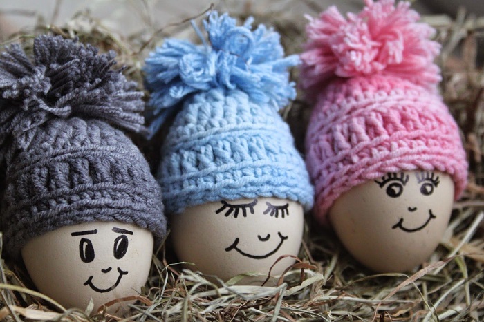Если вы увлекаетесь рукоделием или просто хотите, чтобы яйца на праздничном столе выглядели максимально оригинально, свяжите для них милые шапочки. Никогда не держали спицы в руках? Тогда зайдите на любой маркетплейс и подберите там варианты «головных уборов», которые понравятся. Шапочки лучше надевать на окрашенные яйца – так они будут выглядеть максимально гармонично. Или можно нарисовать мордочки фломастером.