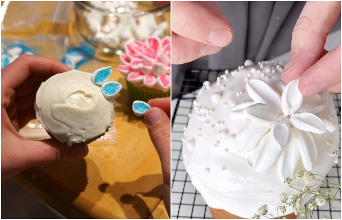 Итак, каждую зефирку нарежьте на небольшие кусочки и слегка разомните пальцами, чтобы придать форму лепестка. После этого выложите их на глазурь в виде цветка (важно, чтобы она еще не засохла), а по центру расположите присыпку. Если ее не оказалось под рукой, можете использовать зефир другого цвета – получится тоже очень красиво.