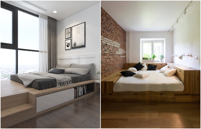 Мало, кто рассматривает такой вариант размещения кровати, но на деле оказывается, что это поистине гениальная идея (особенно, когда речь идет о маленькой спальне). Подиум выполняет сразу две важные функции. Во-первых, он зонирует комнату, визуально разделяя ее на две части. А во-вторых, становится отличной альтернативой комоду или даже шкафу. Обычно в подиум встраиваются выдвижные ящики, в которых удобно хранить сезонную одежду, постельное белье и прочие вещи. А на верхние полки удобно класть телефон, книгу, которую вы читаете перед сном, ставить стакан с водой и пр. Также их можно использовать для размещения декора – постеров в рамах, фигурок, свечей.