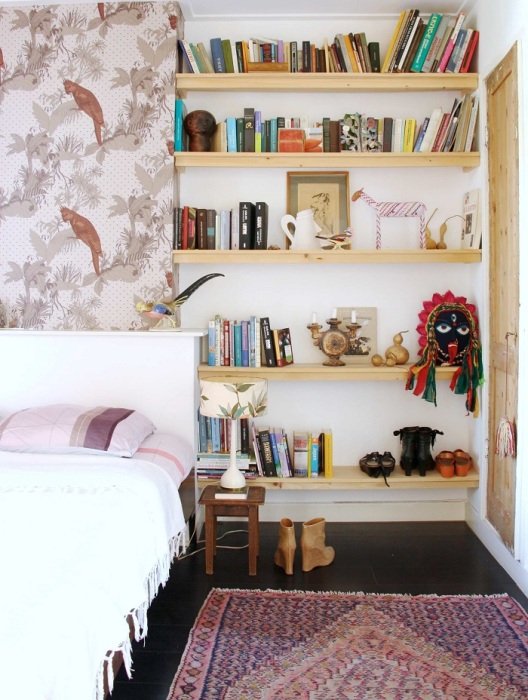 Не все квартиры радуют идеальной планировкой – иногда встречаются и странные архитектурные решения, с которыми приходится мириться. Взять, к примеру, нерациональную выемку в стене. На первый взгляд кажется, что это одно сплошное наказание, которое мешает разместить в комнату нужную мебель. Но если грамотно подойти к вопросу обустройства спальни, то из этой выемки получится сделать прекрасную систему хранения. Просто заполните ее полками от пола до потолка и наслаждайтесь результатом.