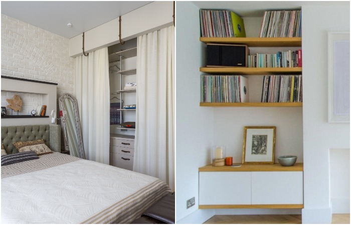 Иногда углубления в стене – это то, что досталось нам «по наследству» вместе с квартирой, а иногда мы делаем их самостоятельно, чтобы сделать хранение более функциональным. Как бы то ни было, в маленьких спальнях такие конструкции полностью оправданы. Их можно использовать по-разному, в зависимости от размера. Отличная идея – сделать в нише библиотеку, если у вас много книг. Также там можно обустроить полноценный шкаф для одежды или даже разместить рабочее место (стол, стул и ноутбук). При планировании отталкивайтесь от габаритов ниши и своих потребностей – размещайте в ней то, что хотели бы видеть в спальне.