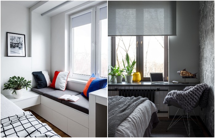 Если подоконник в спальне низкий, использовать его в качестве рабочей поверхности не получится. Но это не повод расстраиваться – из него выйдет прекрасная зона отдыха. Купите мягкий матрас по размеру, положите несколько подушек, плед, чтобы можно было удобно разместиться вместе с книгой или чашкой кофе. А если кровать расположена рядом с окном, сделайте зону отдыха ее логическим продолжением. Получится интересно и функционально.