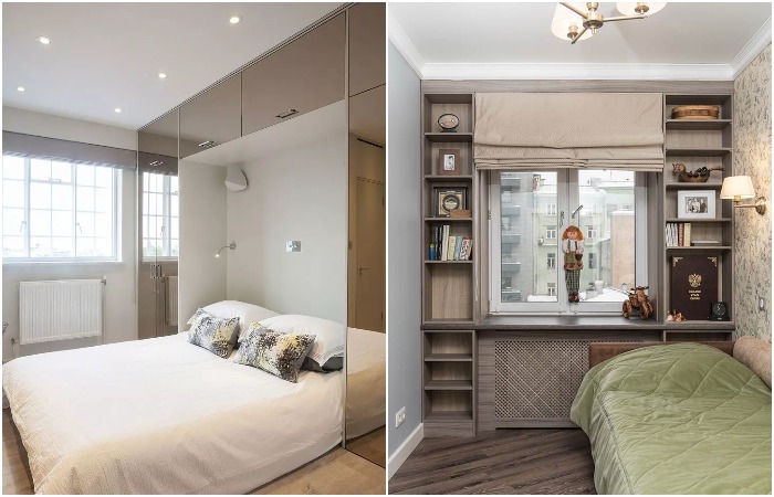 Не хотите сооружать шкаф вокруг окна? Тогда задействуйте пространство около кровати. Обычно стена за ней и по бокам остается пустой, а ведь это отличное место для хранения самых разных вещей. Оптимальный вариант – по бокам соорудить полноценные модули, а над самой кроватью повесить открытые полки, чтобы не перегружать пространство. Не переживайте – зрительно конструкция не будет выглядеть слишком массивно.
