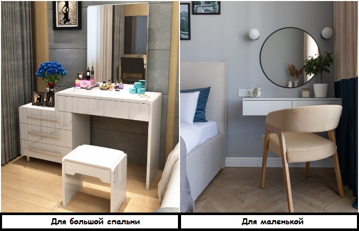Очень часто хозяева спальни отказываются от туалетного столика, считая, что он занимает слишком много места. Однако, если правильно выбрать мебель, такого эффекта не будет. Отличное решение – небольшое стеклянное изделие, которое выглядит легко и невесомо, полностью растворяясь в пространстве. Кстати, столик можно установить сбоку от кровати – тогда он будет выполнять роль еще и прикроватной тумбы, а вы сможете убить двух зайцев одновременно.