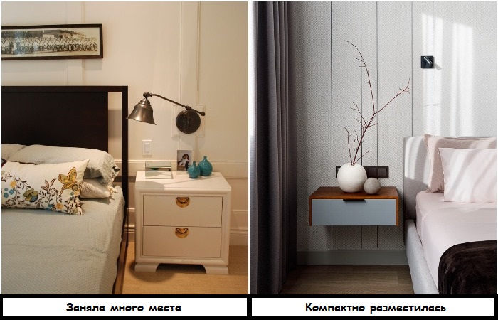 Как насчет того, чтобы освободить пол и сделать прикроватную тумбу подвесной? Такая конструкция занимает минимум места, не выглядит громоздко, но при этом дает достаточное количество площади для хранения. Или же, если не хотите сверлить стену, присмотрите легкую подставку на тонких, почти невидимых ножках. Она тоже будет смотреться легко и воздушно.