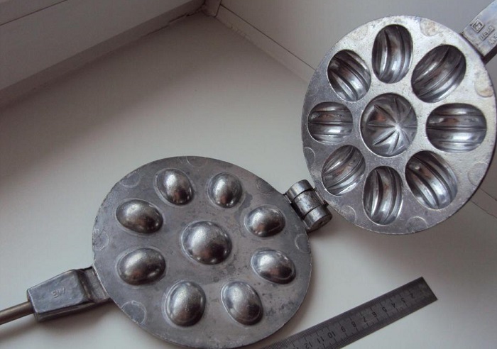 Внешне советская орешница напоминает две тяжелые металлические сковородки, соединенные между собой, с выемками для теста. Девайс нужно смазать растительным маслом, поставить на плиту, дождаться, пока он разогреется, затем заполнить формы тестом, закрыть и подождать некоторое время, пока печенье будет готово. Огонь должен быть небольшим, чтобы тесто хорошо пропеклось и не сгорело. Пользоваться такой штукой непросто, нужно приноровиться, однако вкус готовых орешков того стоит – они получаются прямо как в детстве.