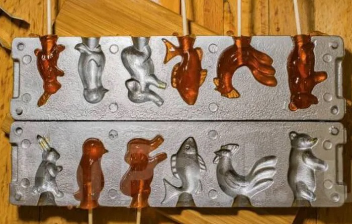 Еще один десерт родом из детства. Леденцы на спичке были настолько популярными, что ради них хозяйки могли испортить плиту или сжечь кастрюлю, стоило лишь на секунду отвернуться. Также формы часто использовали для приготовления ирисок и шоколадных конфет (эти процессы были менее опасными).