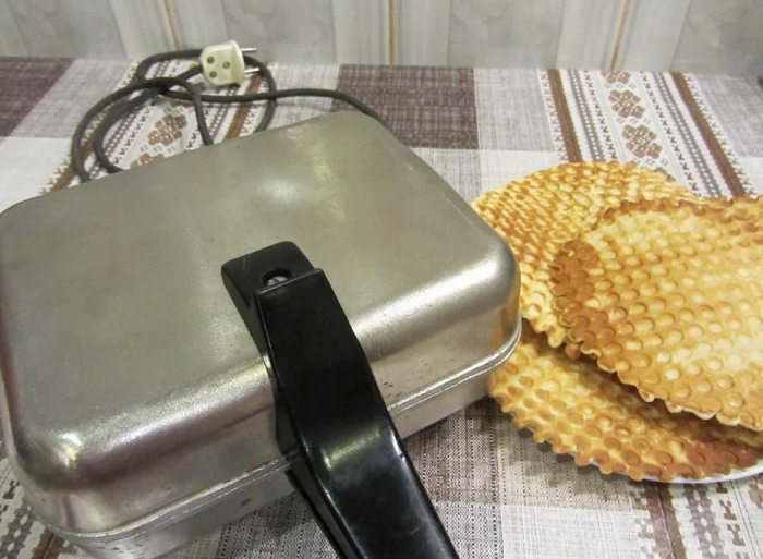Про орешницу поговорили, теперь самое время вспомнить про вафельницу. Такой прибор был у многих советских хозяек, и дети всегда с нетерпением ждали, когда же по квартире будет витать восхитительный запах свежеиспеченных хрустящих вафель. Чаще всего в таком устройстве готовили знаменитые трубочки, которые можно было наполнить вареньем, сгущенкой или заварным кремом (хотя многие ели с удовольствием и пустую выпечку).