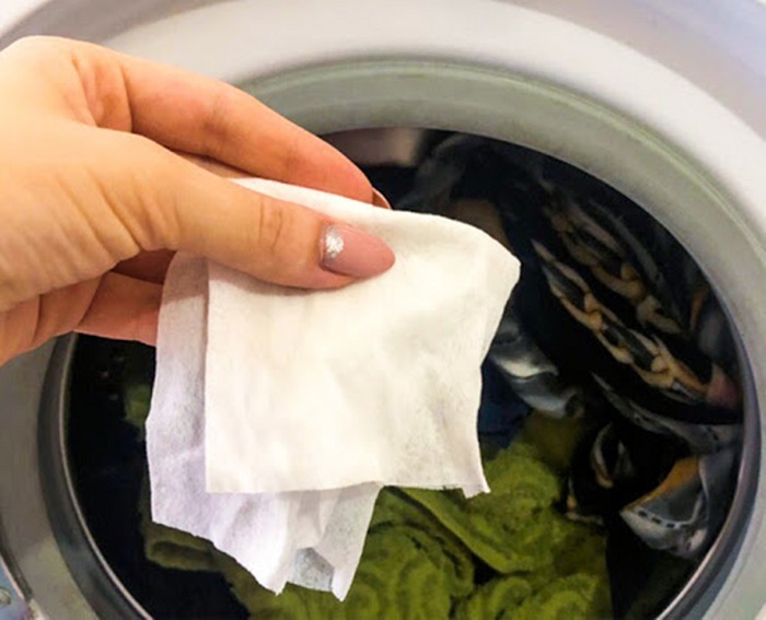 Для этого лайфхака лучше использовать плотные салфетки из нетканого материала с нейтральным запахом. Количество должно варьироваться в зависимости от белья: если вы стираете несколько футболок и платьев, тогда будет достаточно одной салфетки, если же барабан загружен почти полностью, тогда кладите две-три.