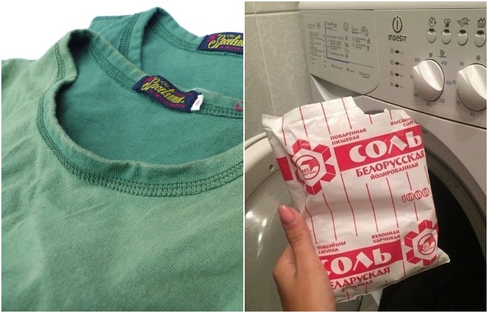 • Соль. Если после нескольких стирок вы заметили, что ткань поблекла, возможно, она плохо выполаскивалась и в ней накопились моющие средства. В этом случае нужно добавить в машинку 150 граммов соли. Она поможет вывести остатки порошка, и вещь вновь станет привлекательной. Кстати, эксперты рекомендуют всегда стирать одежду с солью, чтобы сохранить ее первоначальный оттенок.