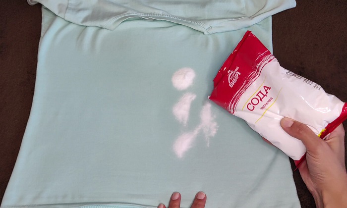 Смешайте соду с небольшим количеством воды, чтобы получилась кашица, нанесите ее на загрязненный участок и оставьте примерно на 20 минут. После этого смойте остатки средства теплой водой и отправьте одежду в стирку. А чтобы усилить эффект, в соду можно добавить несколько капель жидкого хозяйственного мыла. В этом случае получится устранить не только свежие, но и застарелые пятна.