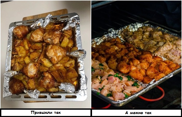 Если вы пока не планируете покупать дорогой бытовой шкаф с технологией, которая позволяет готовить два блюда одновременно, предлагаем вариант попроще (и подешевле). Для этого возьмите противень, постелите на него фольгу и сформируйте бортики. Таким образом можно сделать две, три или даже четыре секции – все зависит от того, сколько блюд вам нужно приготовить и в каких количествах. В один отсек можно положить мясо, в другой – картофель, в третий – овощи. Это значительно сэкономит время на приготовление ужина. Главное – вовремя доставать блюда, потому что разные продукты нуждаются в разном времени приготовления.