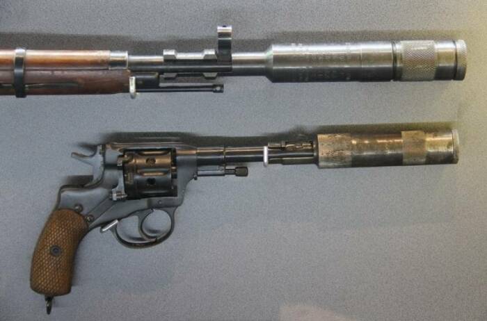 Что интересно, первый глушитель оружейные конструкторы изобрели еще в XIX столетии. Первый серийный образец был создан Хайремом Максимом (младшим) в США в начале XX века. Однако, тогда местная военщина не проявила должного интереса к разработке, в первую очередь из-за высокой цены изделия. Собственные разработки в области ДТК закрытого типа в первой половине XX века проводились и в СССР. Наиболее известными стали изделия братьев Митиных (глушители «БраМит») для винтовок Мосина и револьверов Наган. И хотя «БраМит» не получил повсеместного распространения в годы Великой Отечественной войны, закрытые ДТК всё-таки активно использовались бойцами советских разведывательных, диверсионных подразделений, а также бойцами партизанских отрядов.