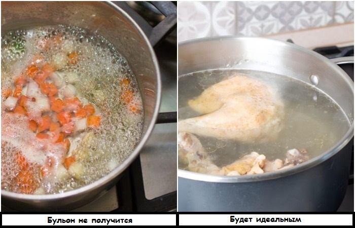 • Мы так мало уделяем времени приготовлению вкусного, насыщенного бульона, а ведь это основа для большого количества блюд, включая соусы. То, что нам подают в ресторанах, поражает своим потрясающим вкусом как раз потому, что повара тщательно варят бульон. Как сделать так, чтобы он стал идеальным? Во-первых – заливайте продукты не горячей, а холодной водой, и варите их без крышки. Во-вторых, не позволяйте бульону слишком сильно кипеть, и постоянно убирайте всплывающую пену и жир. В-третьих, если вы готовите бульон на кости, предварительно поместите ее в холодную воду и уберите в холодильник на 12 часов – так из нее уйдут все примеси, которые делают бульон мутным.