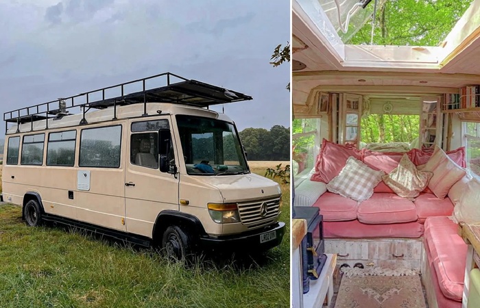 Чтобы жилище получилось уютным и теплым, ведь автобусом планировали пользоваться на территории Великобритании, девушка обшила стены, полоток и пол повторно использованной натуральной древесиной, добавив основательный слой утеплителя. Поскольку энтузиастка была стеснена в средствах, она старалась использовать вторсырье и восстановленную древесину. Она шла не только на отделку, но и изготовление встроенной мебели в стиле шебби-шик.