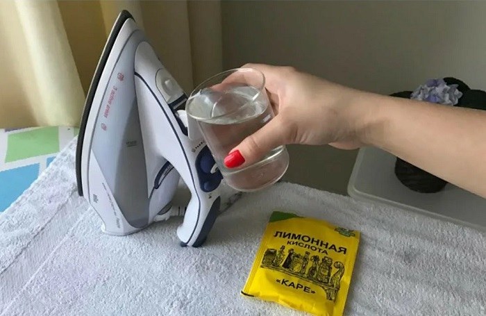 Чтобы избавиться от накипи, можно использовать лимонную кислоту. Наверняка вы постоянно ее используете, чтобы очистить чайник – так вот, с утюгом она действует аналогично. Налейте в миску 200 миллилитров воды, растворите в ней 20-25 граммов лимонной кислоты, тщательно размешайте и подождите, пока она полностью растворится. Для удобства перелейте получившийся раствор в стакан, а затем заполните им резервуар для воды.