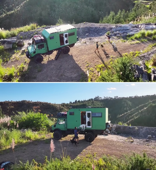 Поскольку Mercedes-Benz' Unimog – это обычный грузовик с открытым кузовом, энтузиастам пришлось заказывать разборной объем размером 4,2 на 2,4 метра, который впоследствии и стал их уютным домом. Но прежде чем это произошло, молодые люди внесли некоторые дополнения в сам грузовик, которые повысили функциональность их мобильного жилища. Предусмотрели установку солнечных панелей и выдвижной тент, обеспечивающий защиту для зоны отдыха на свежем воздухе, когда они планируют оставаться в одном месте в течение длительного периода времени. Терраса позволяет увеличивать жизненное пространство в хорошую погоду. Также обустроили скрытых и вместительных систем хранения, включая багажник на крыше.