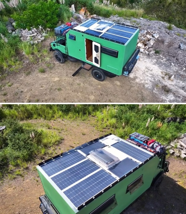 Поскольку пара переоборудовала грузовик с конкретной целью – путешествовать по самым глухим и непроходимым местам, которые уж точно далеки от цивилизации, без установки жизнеобеспечивающих систем и оборудования не обошлось. Так в мобильном доме появились: 1275 Вт солнечные панели, которые питают аккумуляторную батарею емкостью 600 Ач, емкость на 200 литров для питьевой воды и 50-литровый бак для сточных вод.