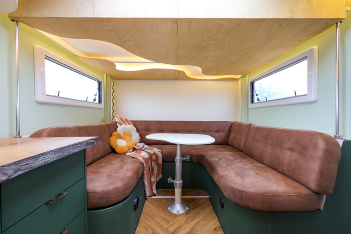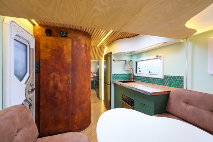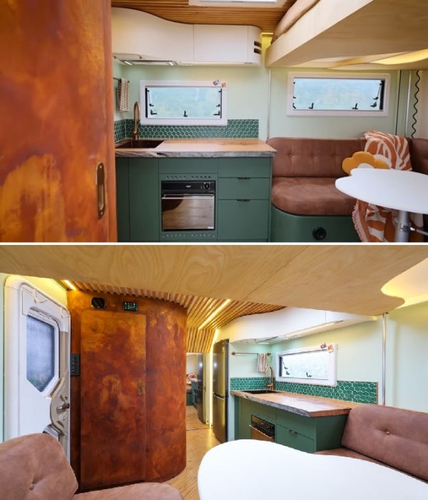 Учитывая, что пара намеревалась жить в своем мобильном доме на постоянной основе и вдали от центральных инженерных коммуникаций, энергоэффективности дома они уделили основное внимание. Создание основательного и максимально безопасного теплоизоляционного слоя и правильный выбор материала для отделки внутреннего пространство обеспечивают здоровым микроклиматом и постоянной температурой. А вот эстетической привлекательности интерьера поспособствовали навыки Луи и дизайнерские таланты Кайлы.