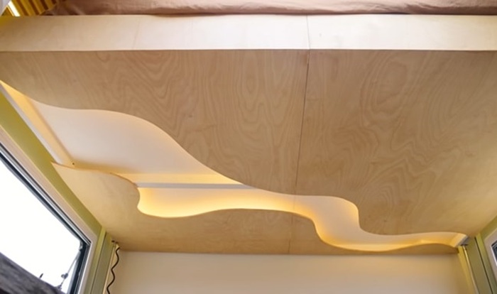 Будучи плотником со стажем, ему удалось оформить потрясающее жилое пространство, в котором преобладают натуральные материалы. Деревянные реечные потолки, фигурная надстройка, являющаяся поддерживающей конструкцией для кровати, встроенный радиальный шкаф, выполняющего заодно функцию ванной комнаты, изготовленная на заказ мебель, вдохновленные природой цвета и достаточное естественное освещение – все это делает интерьер уютным и гостеприимным. Такое оформление полностью соответствует предпочтениям дуэта, который хотел иметь жилище максимально приближенное как к природе, так и и современному жилищу.