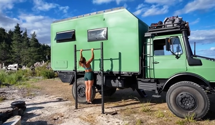 Интересные особенности: Учитывая, что дуэт экстремалов загорелся идеей строительства полноценного жилища, во время трансформации они позаботились об установке выдвижной перекладины, которая позволяет тренироваться, где и когда угодно. По сути, это универсальная модульная силовая стойка, которая помогает поддерживать себя в хорошей физической форме в любом месте, где бы не припарковались на ночлег или более длительное проживание. При этом имеется еще две лестницы, позволяющие попасть как в сам домик (высота жилого объема над землей составляет 1,4 метра), так и на его крышу.