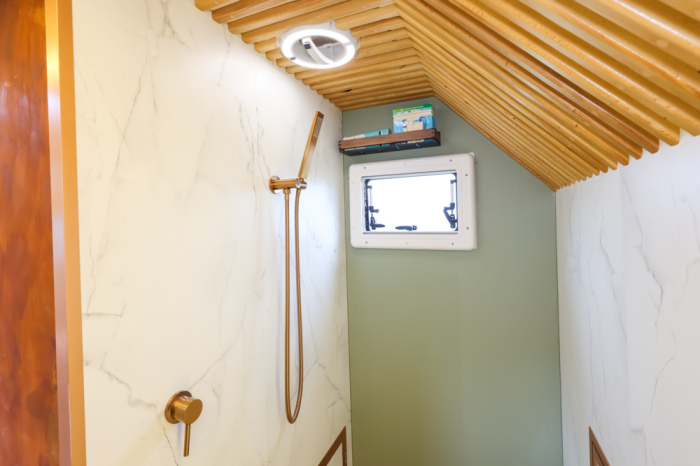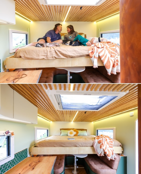 Не менее впечатляет и оформление ванной комнате, в которой Кайле и Луису удалось создать вполне пристойные условия для принятия водных процедур. Обшитая водонепроницаемыми панелями полноразмерная душевая кабина кажется теплой и уютной благодаря деревянному поддону для душа, деревянному реечному потолку и бронзово-медным светильникам. Не обошлось и без установки биотуалета, который можно спрятать в специальном отсеке (в хозяйственном шкафу), когда он не используется или требуется принять душ. Еще одной дизайнерской находкой стало большое зеркало, которое добавляет глубины и делает пространство больше и светлее, а небольшой люк из душевого отсека обеспечивает им прямой доступ в кабину водителя, не покидая уютное гнездышко.