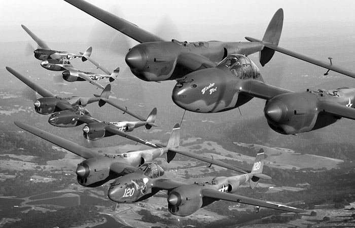 P-38 с его характерным двойным оперением показал большую эффективность на всех театрах войны. С максимальной скоростью около 660 километров в час и мощным вооружением, сосредоточенным в носовой части, он был удобным для атаки бомбардировщиков, так как не требовал ювелирно точного прицеливания. Благодаря дальности и скорости P-38 занял важное место в Тихом океане и Северной Африке, а поздние модификации успешно использовались в европейском небе. При этом тяжёлая конструкция давала преимущества в пикировании, но делала его менее манёвренным на малых высотах.