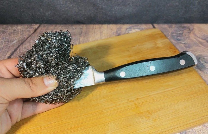На самом деле с помощью подручных средств можно решить практически любую бытовую задачу. Но вернемся к заточке ножей. Чтобы лезвие вновь стало острым, понадобится лишь металлическая губка. Важно, чтобы она была новая. Именно ей стоит пройтись по лезвию с обеих сторон. Всего за пару минут вы вернете своим ножам первоначальную остроту.