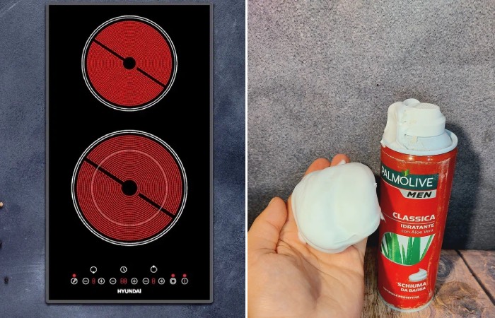 Просто нужно сходить в ванную комнату и взять пену для бритья. Распределите ее равномерно по всей панели и подождите пятнадцать минут. После чего уберите остатки пены влажной тряпкой. Кстати, этот метод вполне можно использовать и с газовыми плитами. Только стоит быть более аккуратными, чтобы пена не попала в форсунки.