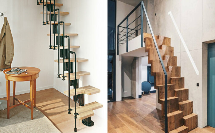 Интересный вариант, который позволит уместить практически любую лестницу в ограниченном пространстве. У неё ступени будут расположены специально под правую и левую ногу для каждого шага на каждой ступени. К ней сначала придётся привыкать, чтобы не путаться на спуске и подъёме, но со временем это уже не будет являться проблемой. И всё-таки сложно сказать, что такая лестница будет комфортной для каждодневного использования. Если этаж, куда она ведёт не часто используется и туда не обязательно подниматься регулярно, то это идеальнейший из вариантов, но если нужно делать это на постоянной основе, такое может быстро надоесть. Контролировать каждый свой шаг не самая комфортная задача. К тому же она подходит только для небольшой высоты, отличный вариант для подъёма не на полноценный этаж, а например, на уровень многоуровневого дома. В ином случае придётся либо привыкать, либо постоянно крепко держаться за перила, потому что если оступиться, другой ступеньки под ногой просто не будет, это может быть опасным.