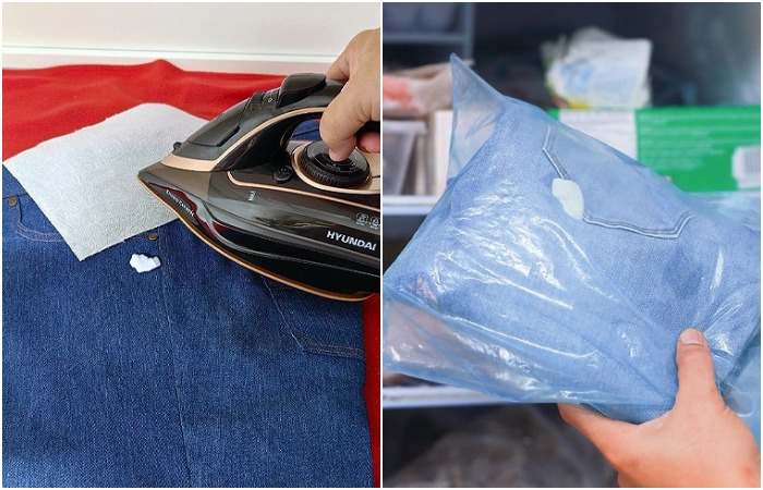 • Сложите испорченную вещь в полиэтиленовый пакет таким образом, чтобы жвачка не касалась его стенок, и отправьте в ящик морозильной камеры на один-два часа. Этого времени хватит для того, чтобы жвачка застыла и отпала сама собой. Если же резинка осталась на месте, аккуратно снимите ее ножом.